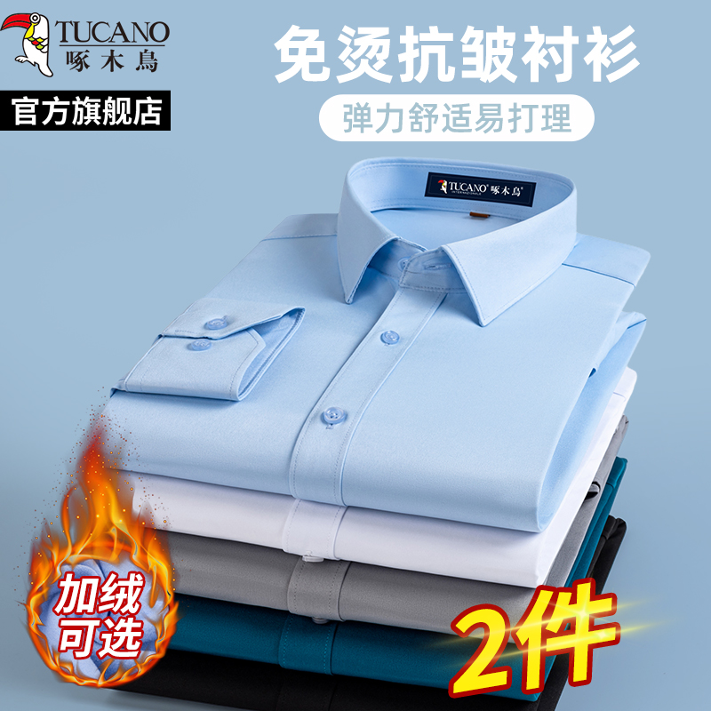 Woodpecker [Stretch Free Ironing] Shirt Men's Long Sleeve Business Formal Work Groomsmen Fleece Thickened Short Sleeve Shirt