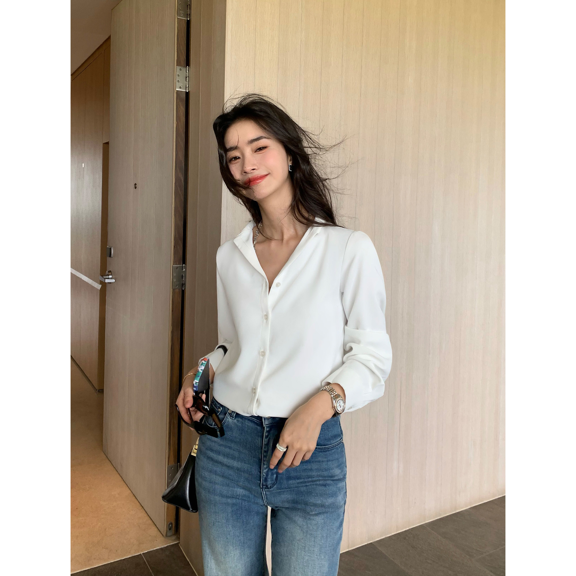 pusumede Ruth is the same style! V-neck long-sleeved white shirt women's spring and autumn loose design niche temperament top