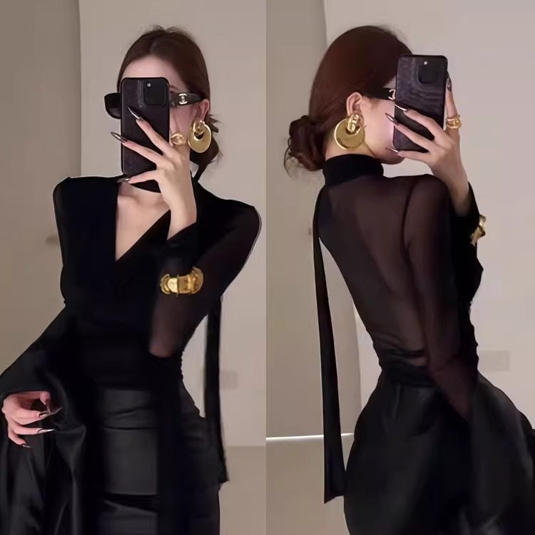 2025 autumn new light luxury royal sister style outfit V-neck halterneck streamer slightly transparent sexy long-sleeved shirt top for women