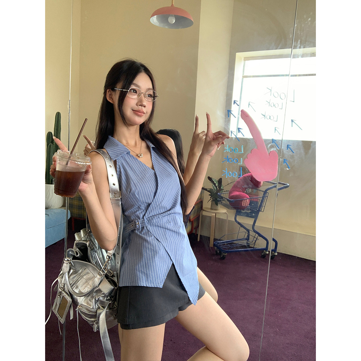 Red Pavilion Sleeveless Shirt Women's Summer 2025 New Blue Striped French Top Temperament Waist Slim Shirt