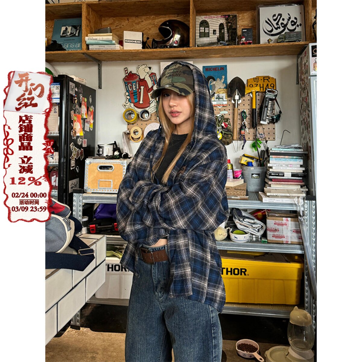Chuanchuan also contrasts plaid American hooded long-sleeved shirt men's and women's retro street loose casual POLO shirt trendy brand
