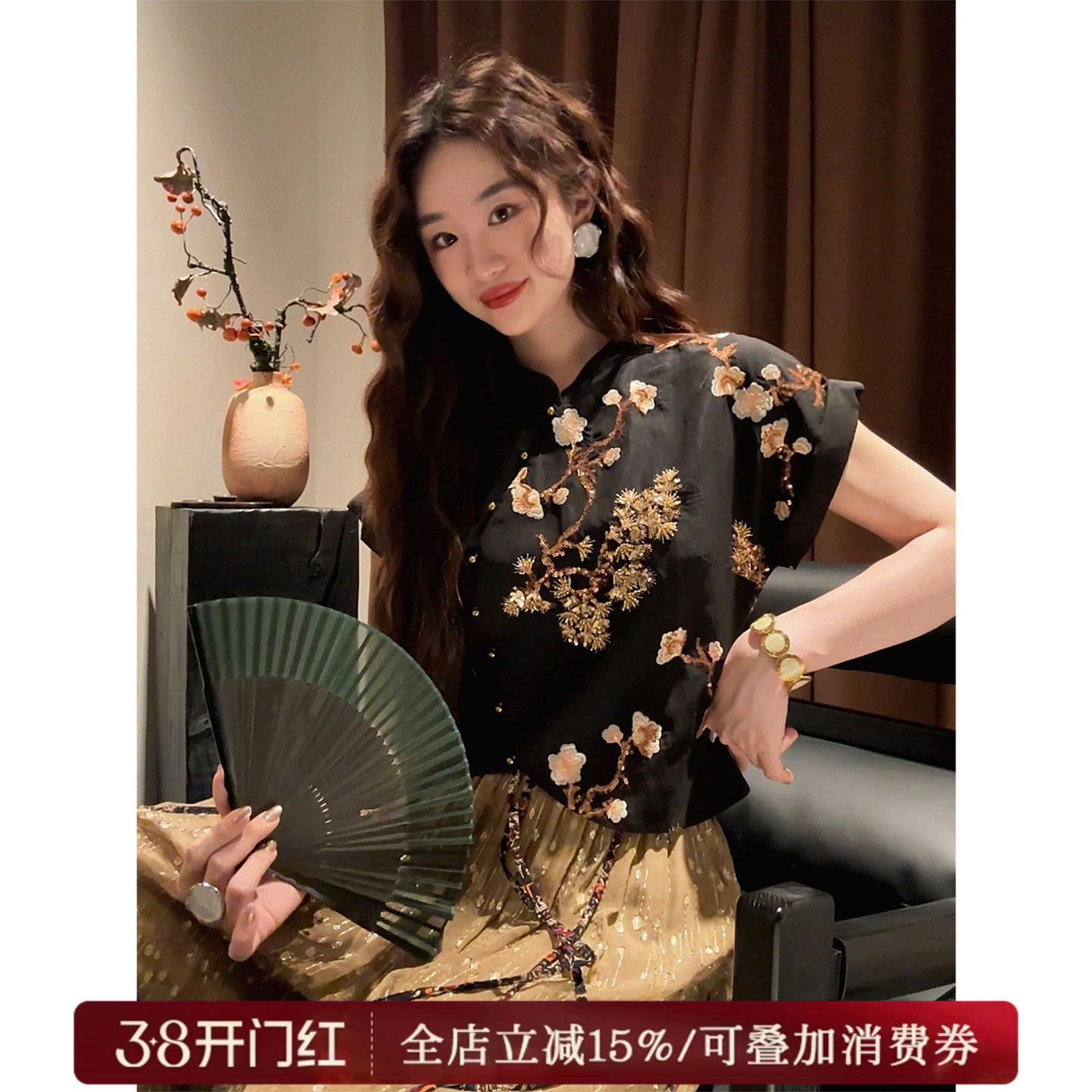 Sanji Heihua [Flower Lying Wine] New Chinese National Style Women's Clothing 2025 New Short-Sleeved Shirt Temperament Women's Top