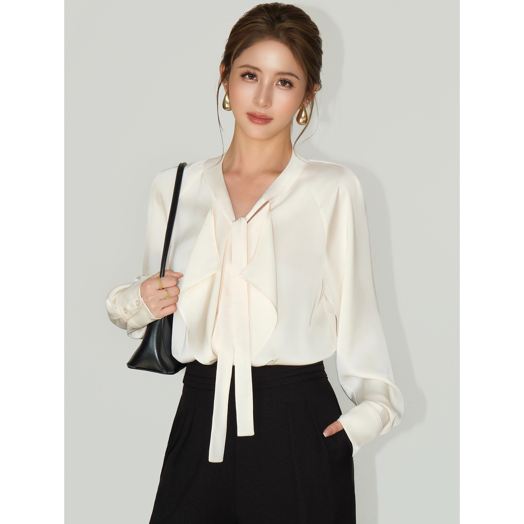 NEVA HU Romantic Time Zone Satin Asymmetrical Streamer Shirt Feminine Elegance Lace-up Loose Shirt