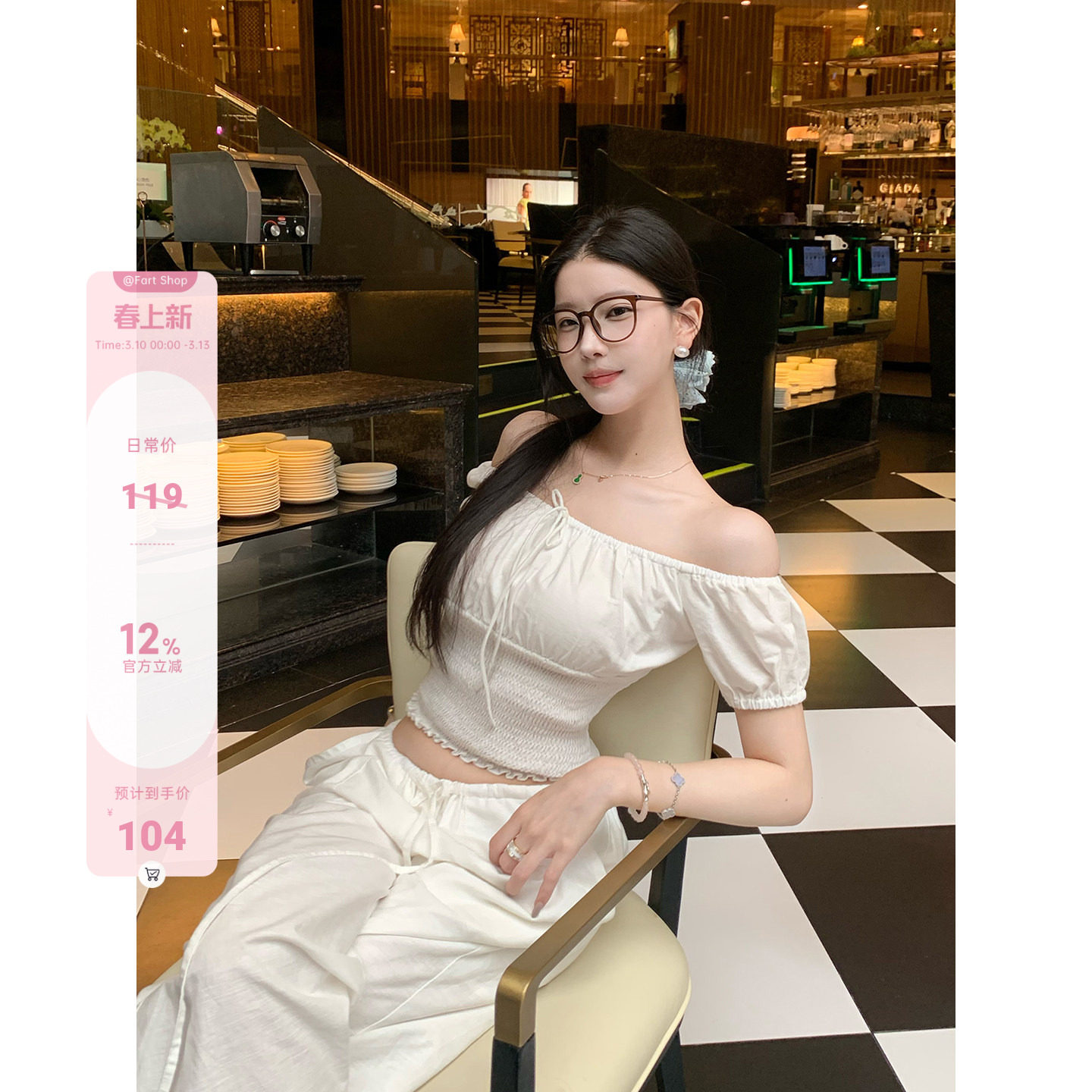 【Fart Shop】Southern French girl one-shoulder pleated design pure want to bare shoulders waist short shirt girl