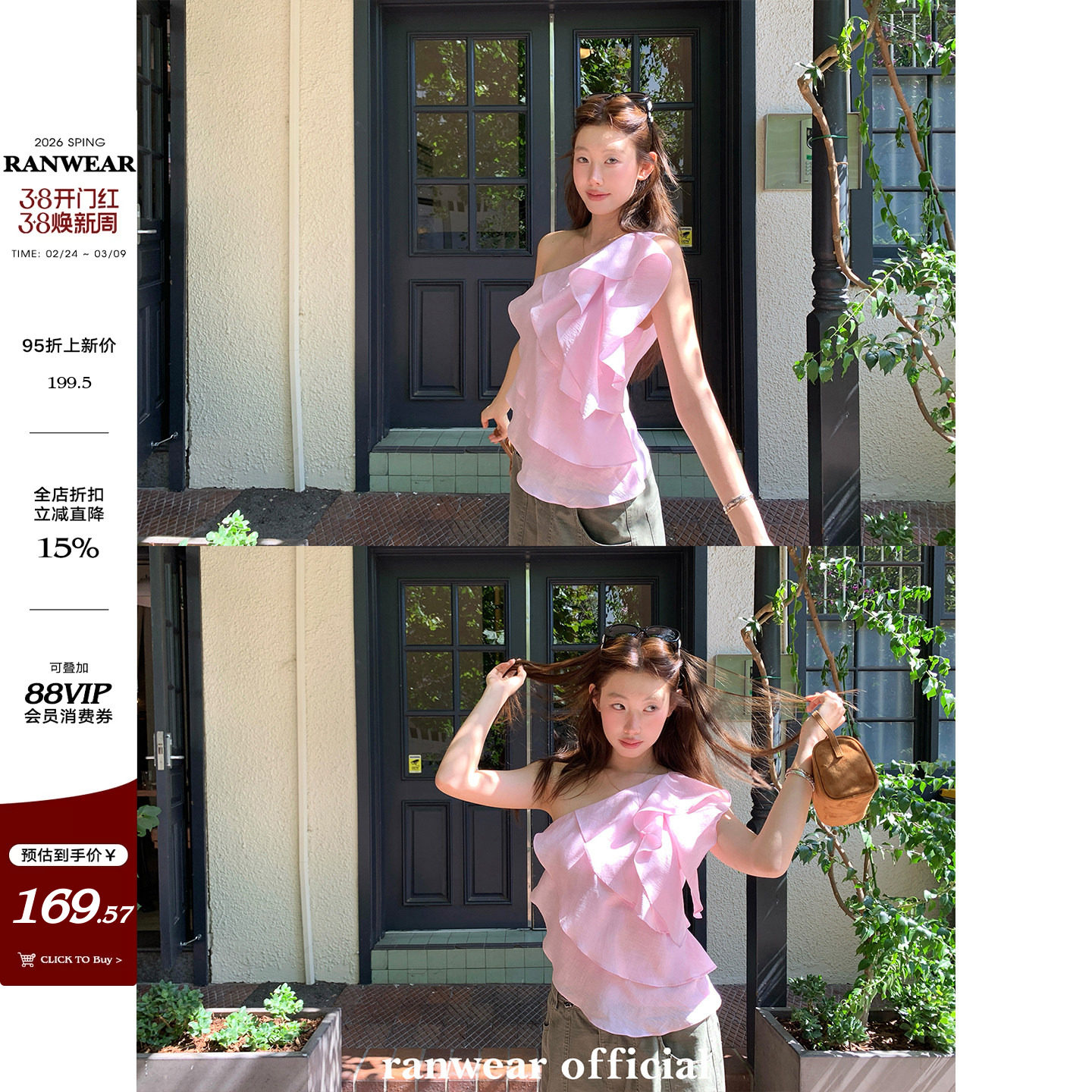Ranwear 'Soft Light Loose Yarn' 57 Lyocell linen multi-layer ruffled streamer one-shoulder suspender cropped top