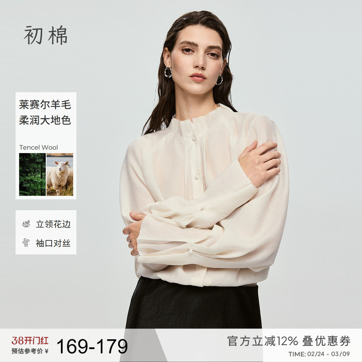 First cotton French lace collar relaxed long sleeve shirt women's 26 spring lyocell wool stand-up collar layered shirt