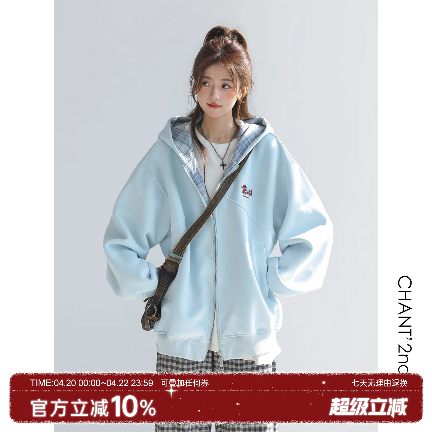 "CHANT2nd" Korean plaid embroidered dachshund jacket women's spring lazy loose sweatshirt cardigan clothes