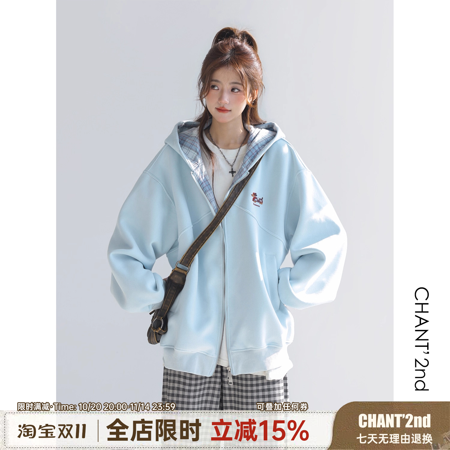 "CHANT2nd" Korean plaid patchwork dachshund embroidered jacket women's spring and autumn lazy loose sweatshirt cardigan