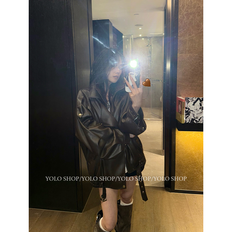 YOLO SHOP Retro Loose Wide Temperament High-end Leather Jacket Women's Autumn Motorcycle Cargo Jacket