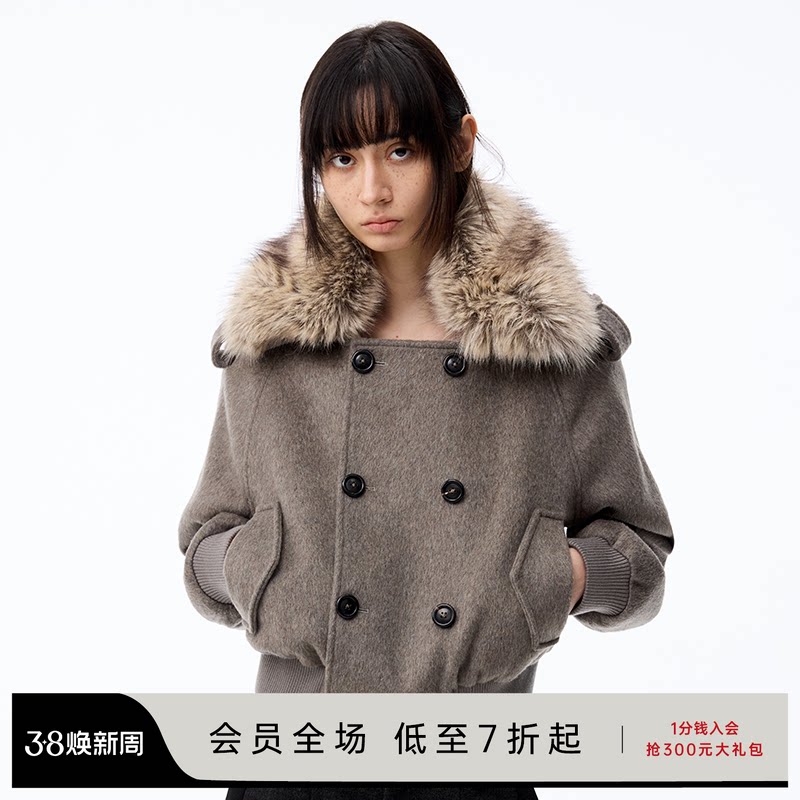 JCAESAR WOMEN Detachable Fur Collar Double-breasted Cropped Tweed Coat Austrian Wool-blend Coat