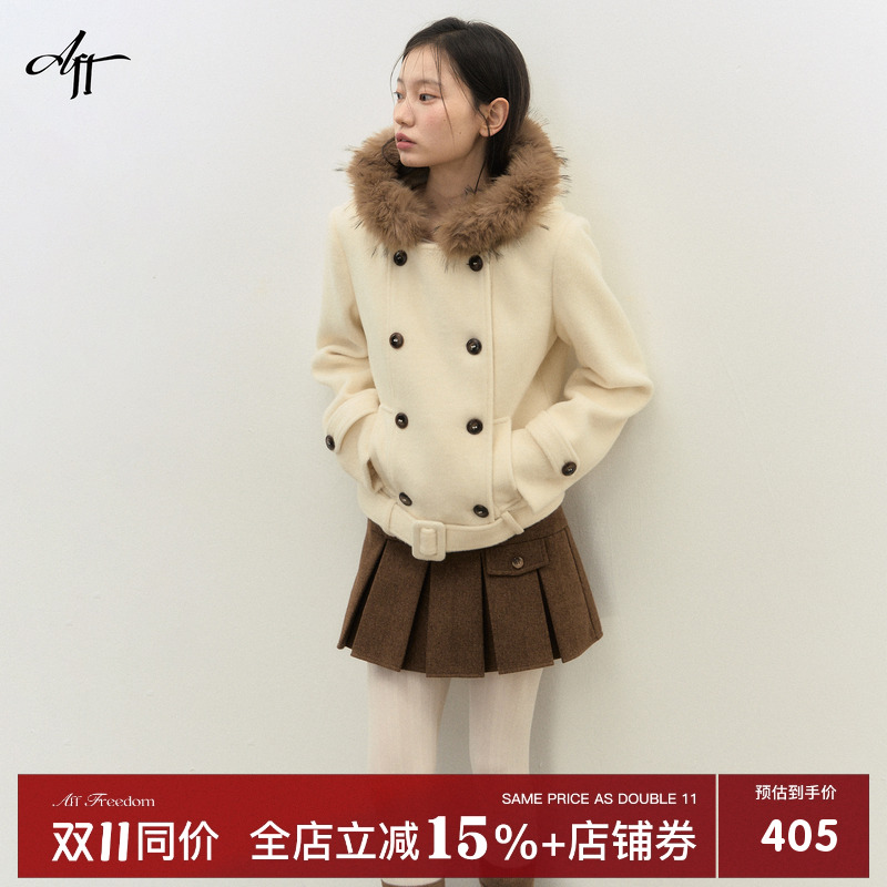 AFFFREEDOM fur collar double-breasted cropped wool wool coat hooded coat women's waist thickened in autumn and winter
