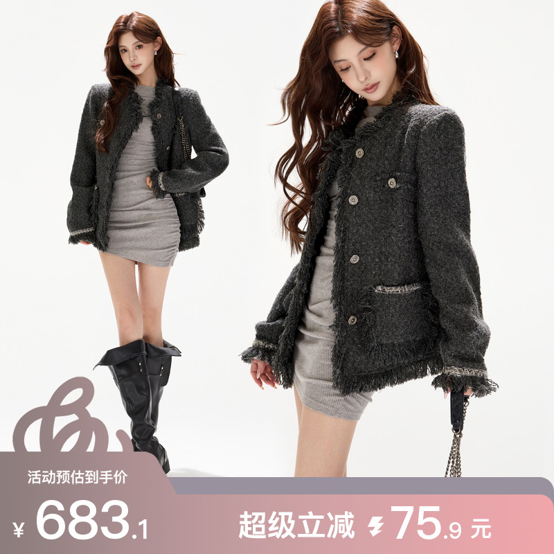 CYNR original design closes eyes into the chaebol daughter style high-quality gray loose tweed small fragrance wool tweed jacket