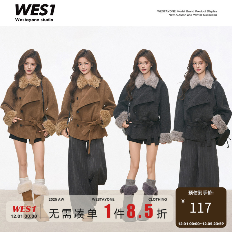 10.7 New WESTAYONE fur collar thickened woolen coat jacket women's small high-end + wide-leg pants