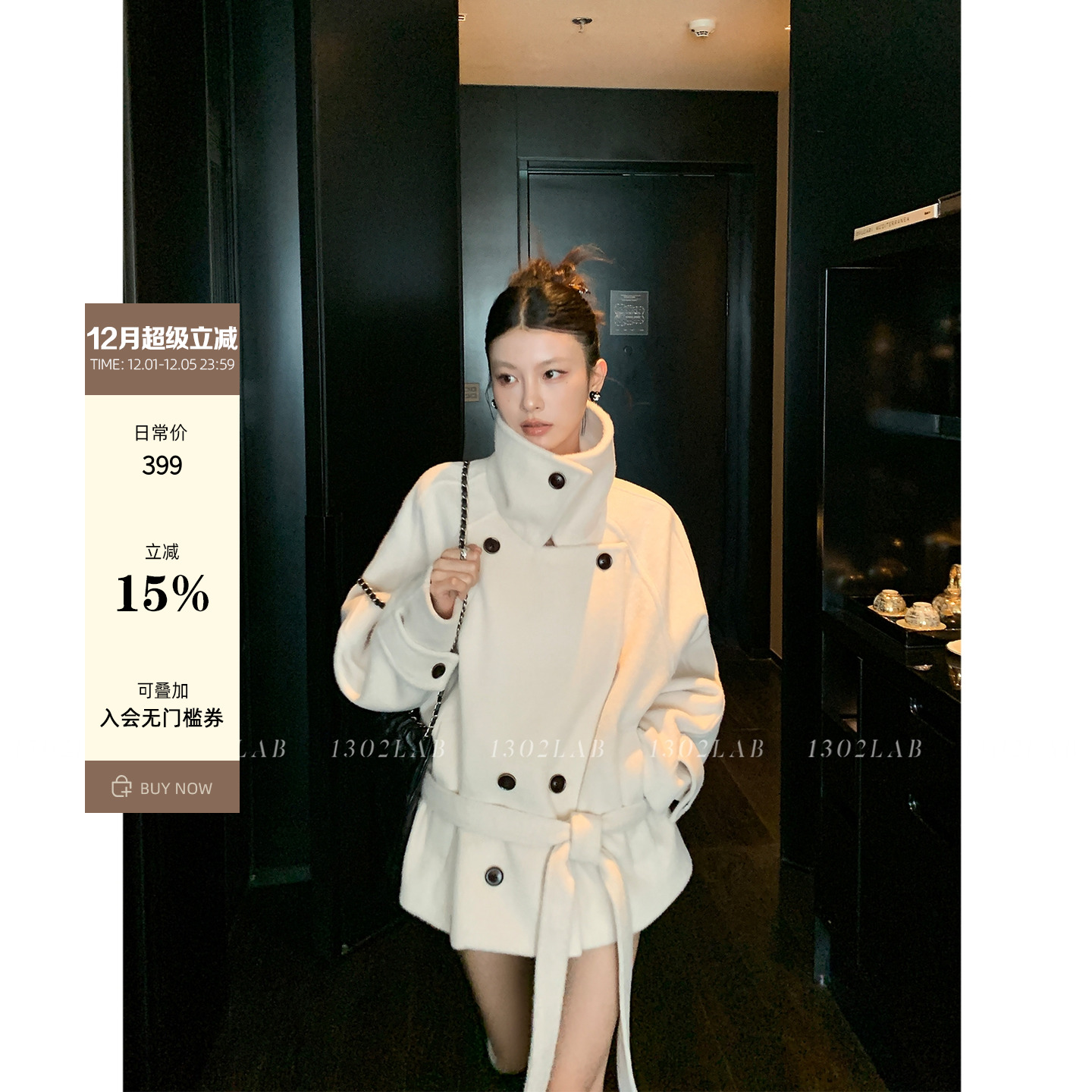 LINONEONE strongly recommends Lem*r-style beige large lapel silhouette woolen jacket with stand-up collar temperament tweed coat