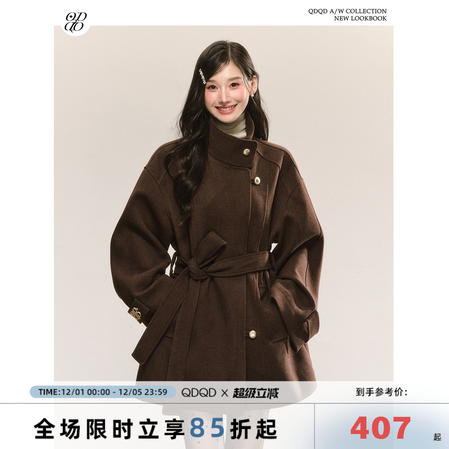 QDQD retro high-end stand-up collar woolen jacket winter new lace-up waist slimming temperament brown coat
