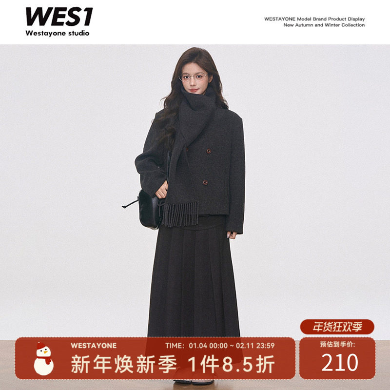 11.6 New product WESTAYONE short women's woolen jacket with scarf commuting versatile + knitted pleated long skirt