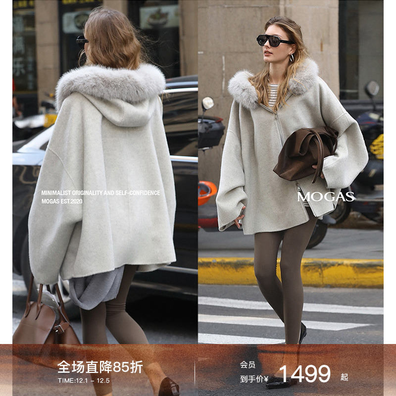 Mogas [star same style] wool camel fleece silk detachable fur collar hooded cape reversible woolen jacket