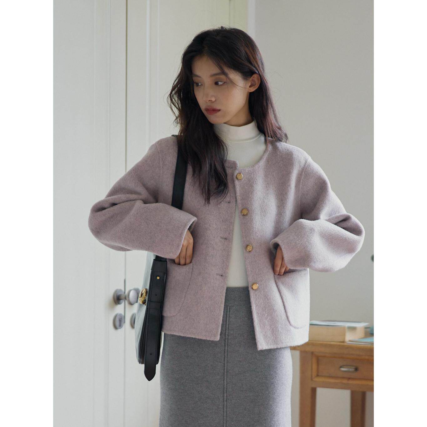 MIXABO purple crew neck reversible tweed jacket women's patch pocket two wear autumn and winter cropped wool wool coat small man