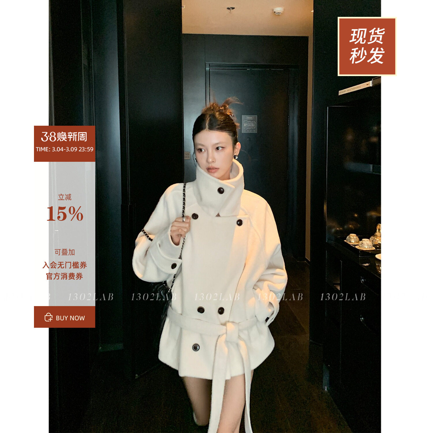 LINONEONE strongly recommends Lem*r-style beige large lapel silhouette woolen jacket with stand-up collar temperament tweed coat