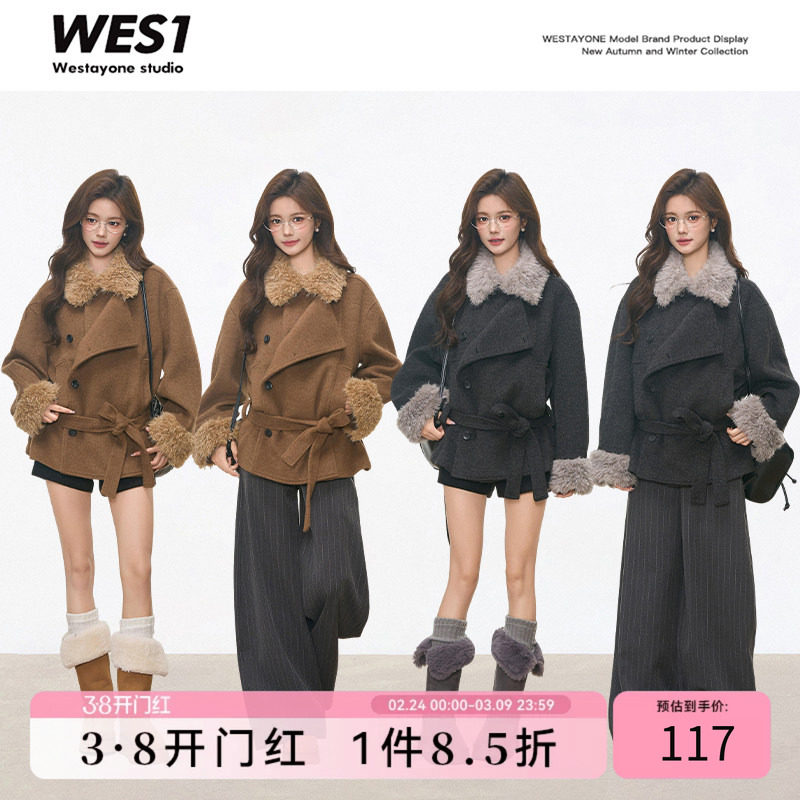10.7 New WESTAYONE fur collar thickened woolen coat jacket women's small high-end + wide-leg pants