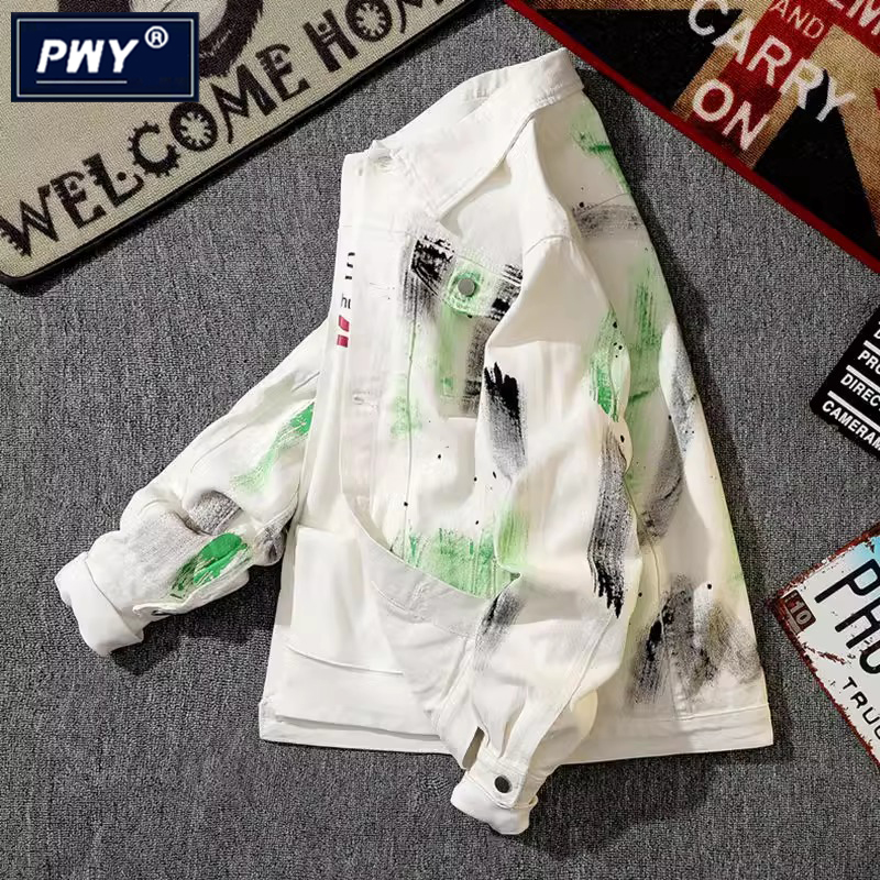 Trendy brand retro hand-painted splashed ink graffiti denim jacket men's spring and autumn casual loose high street ruffian handsome cargo jacket