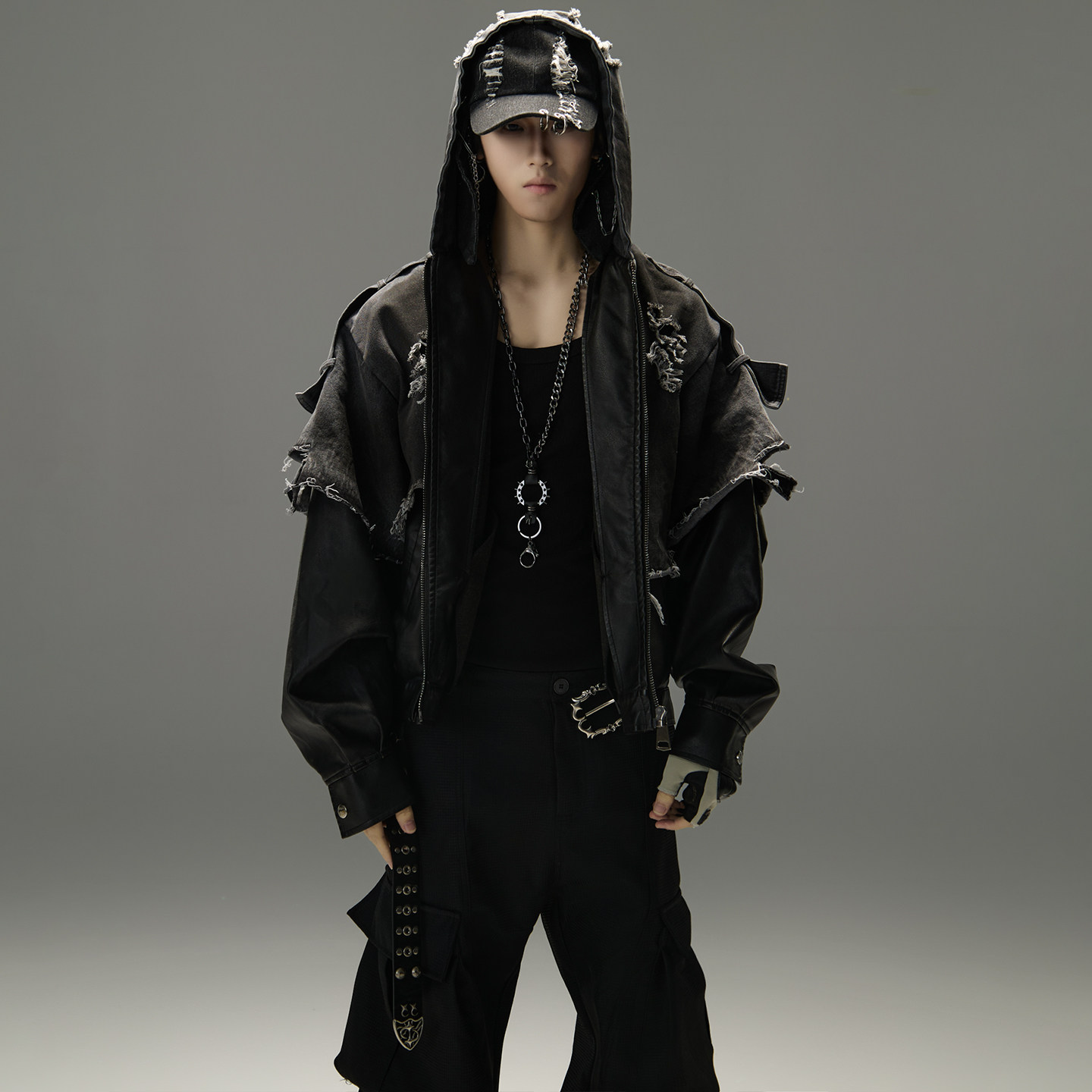 Wasteland style old cat beard shredding patchwork PU denim jacket heavy industry functional street punk hip hop hooded jacket