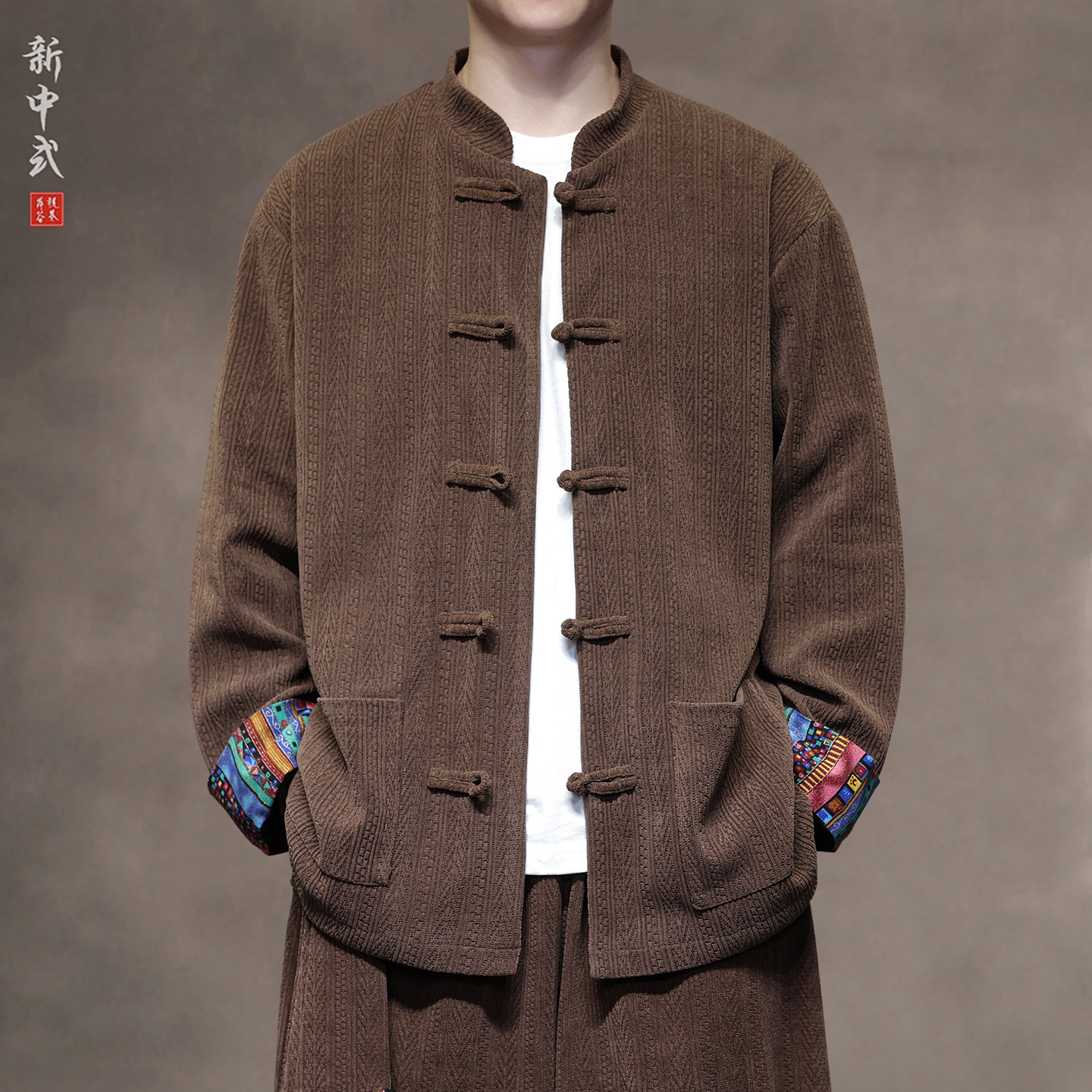 New Chinese Autumn and Winter Chenille Corduroy Tang Jacket Chinese Style Splicing Disc Buckle Tunic Jacket Men's Top