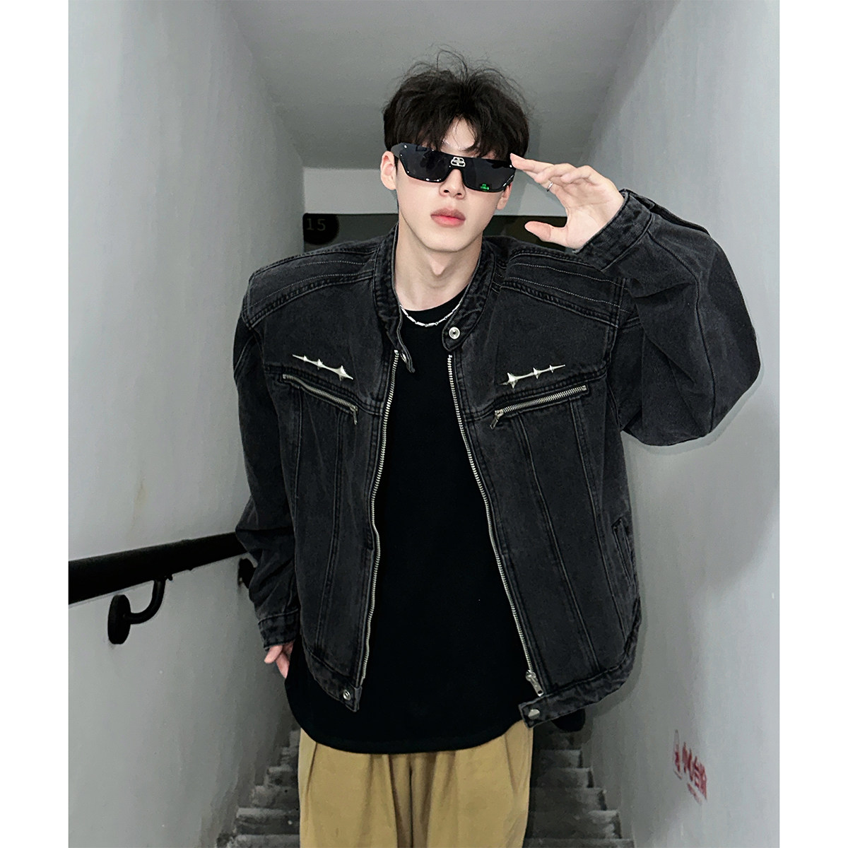 Short shoulder pad denim jacket, men's heavyweight, American high-end ruffian, handsome trendy brand, stand-up collar, washed denim jacket