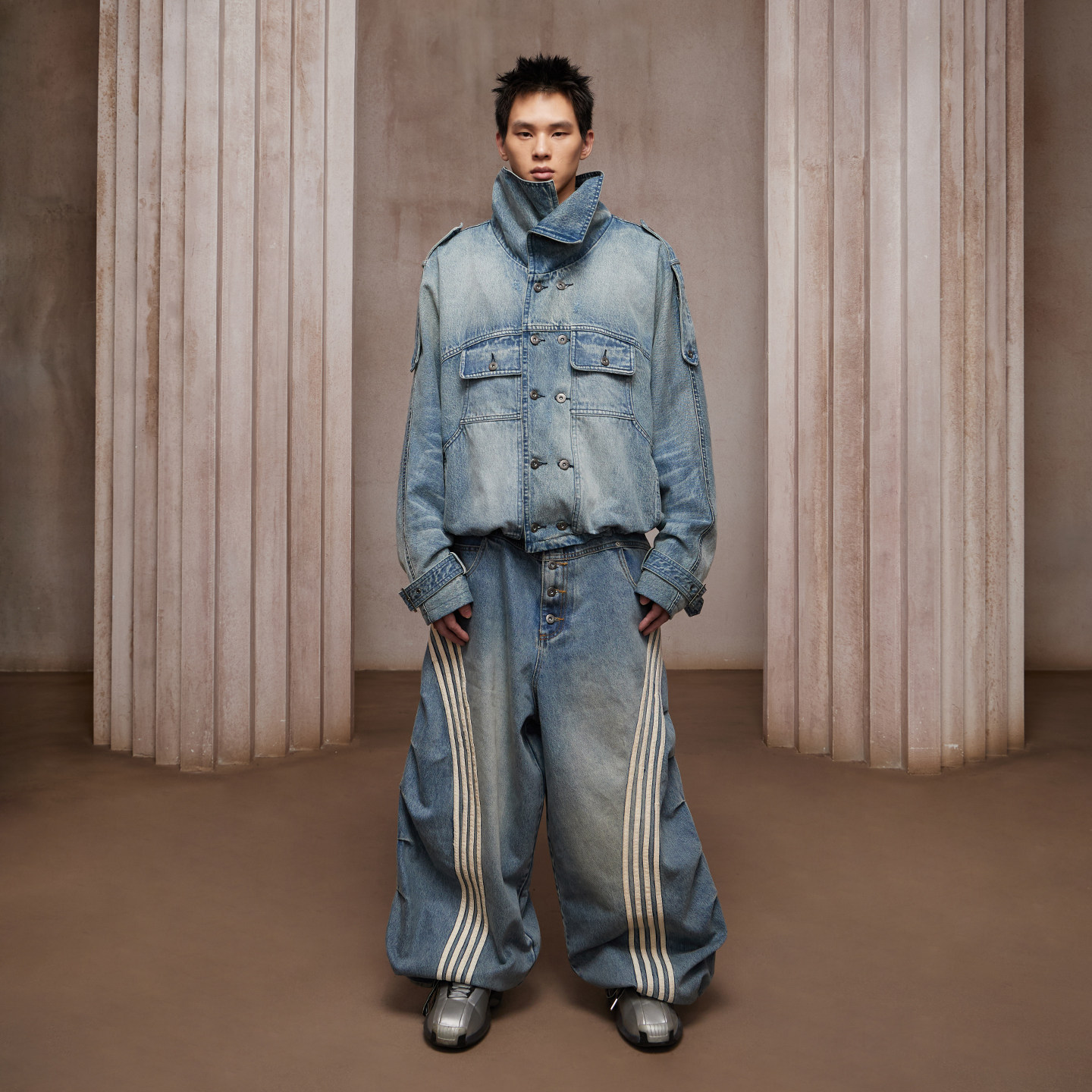 DND4DES American Heavy Industries washed distressed double-breasted multi-pocket short and wide denim jacket stand-up collar jacket trench coat