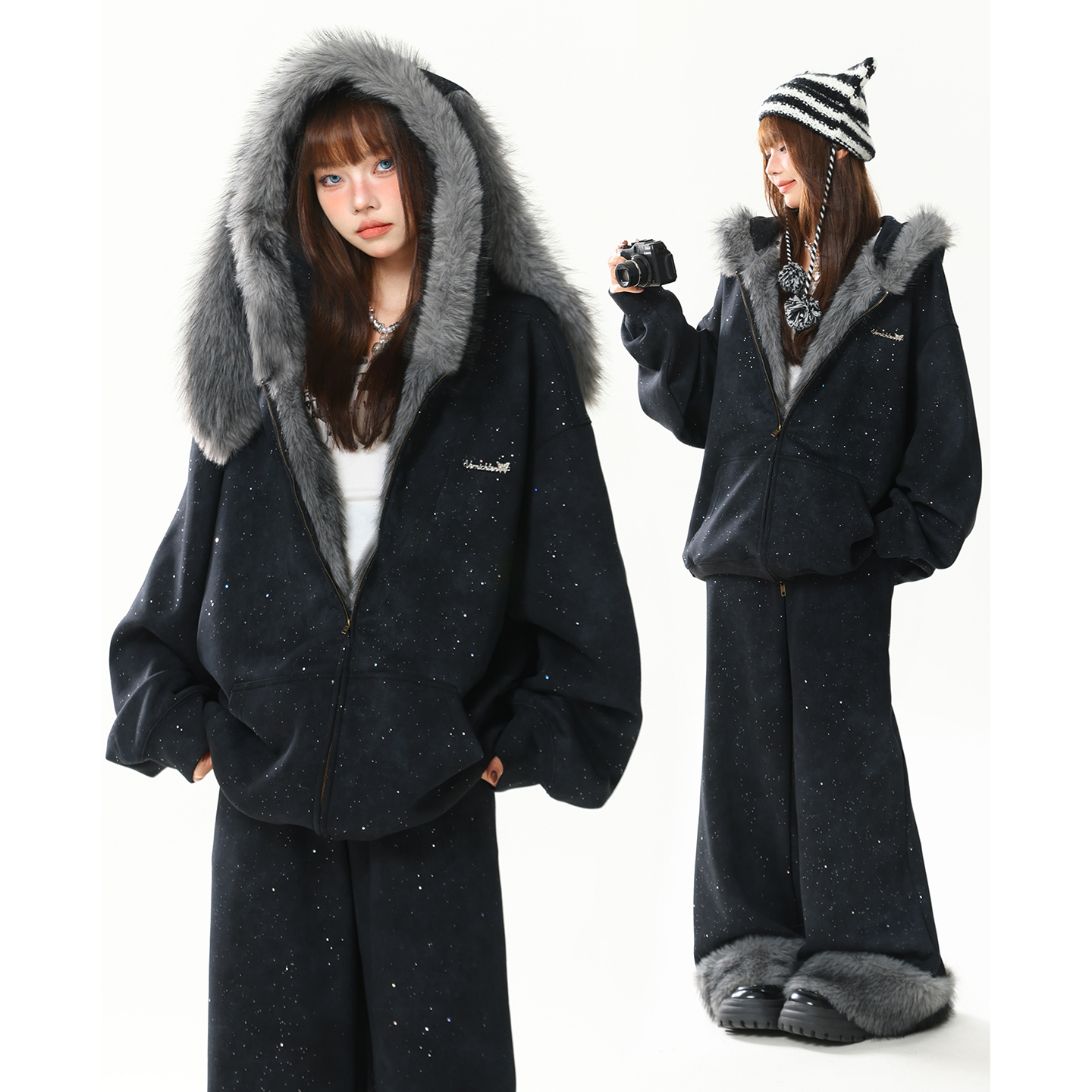 AONW American gypsophila fur collar rabbit ears winter fleece hooded suit women's loose sweatshirt pants two-piece set