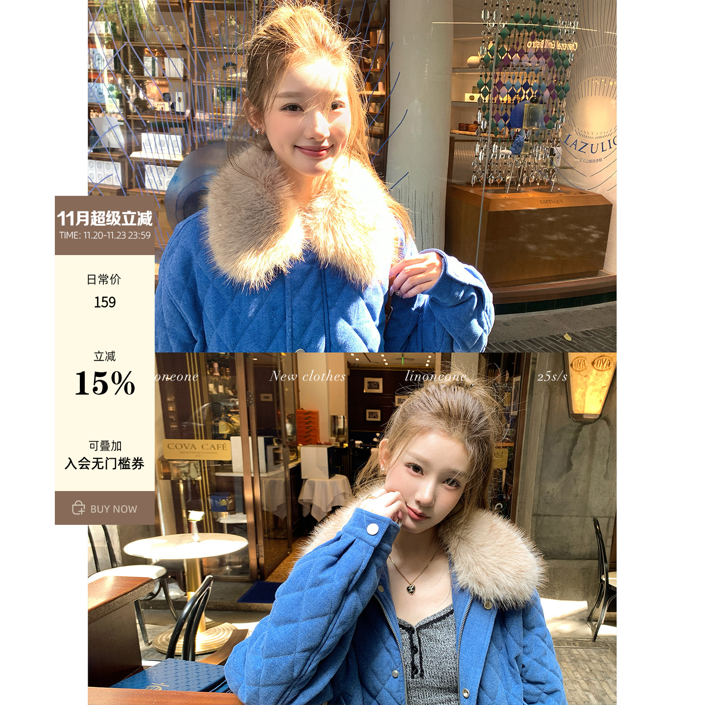 LINONEONE Hokkaido Walk Versatile Blue Diamond Plaid Padded Eco-Friendly Fur Collar Padded Jacket