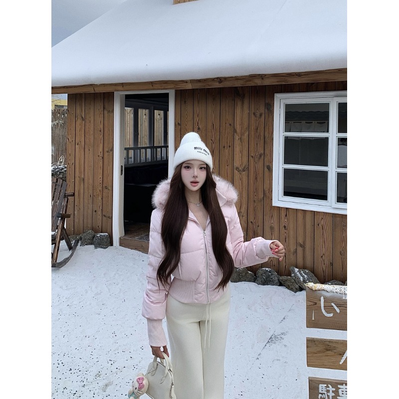 Pink fur collar hooded down jacket women's winter 2025 new fleece thickened warm cotton jacket padded jacket slim jacket