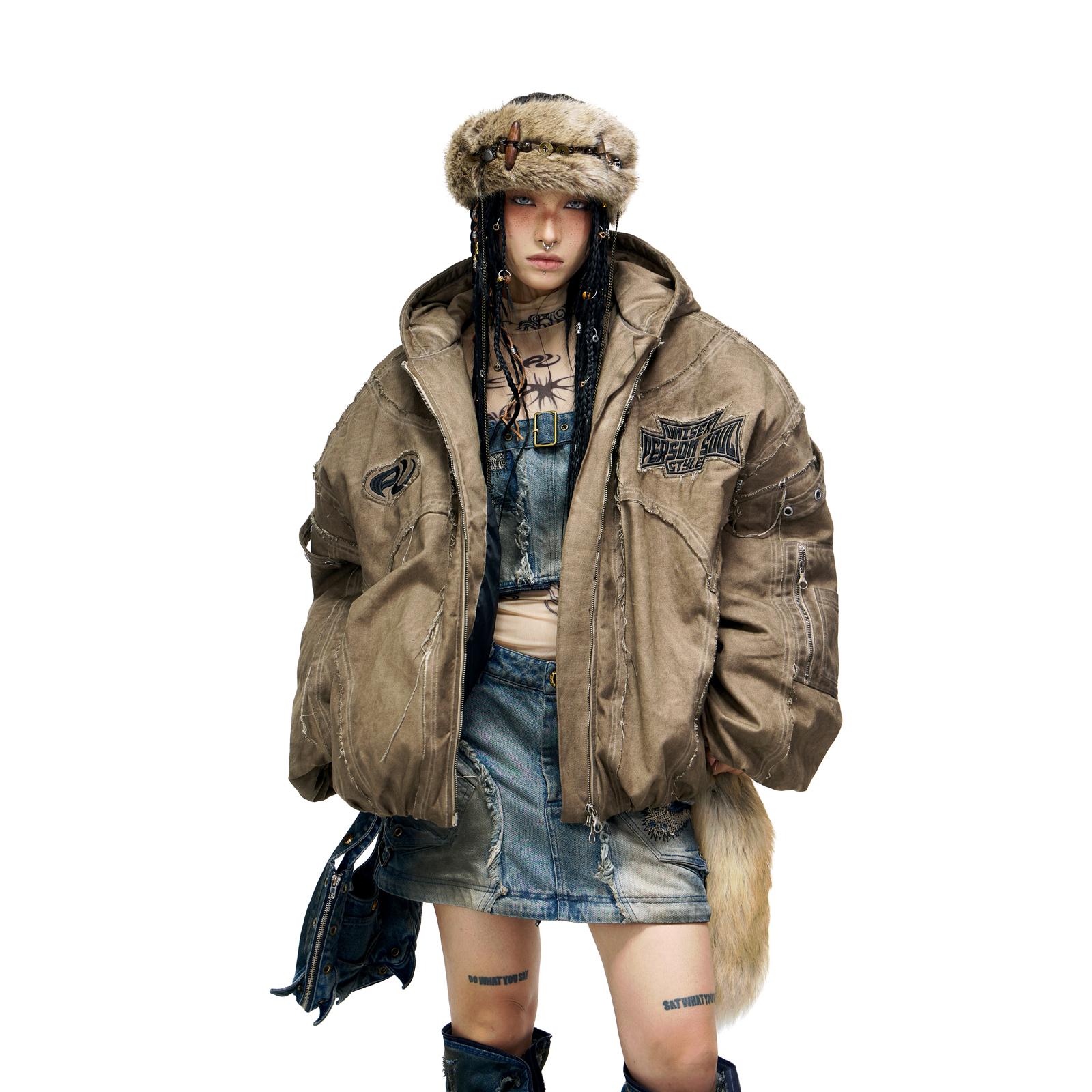 PERSONSOUL* Carved Stain Hand-Brushed Aged Hooded Cotton Jacket/Brown DirtyCoat