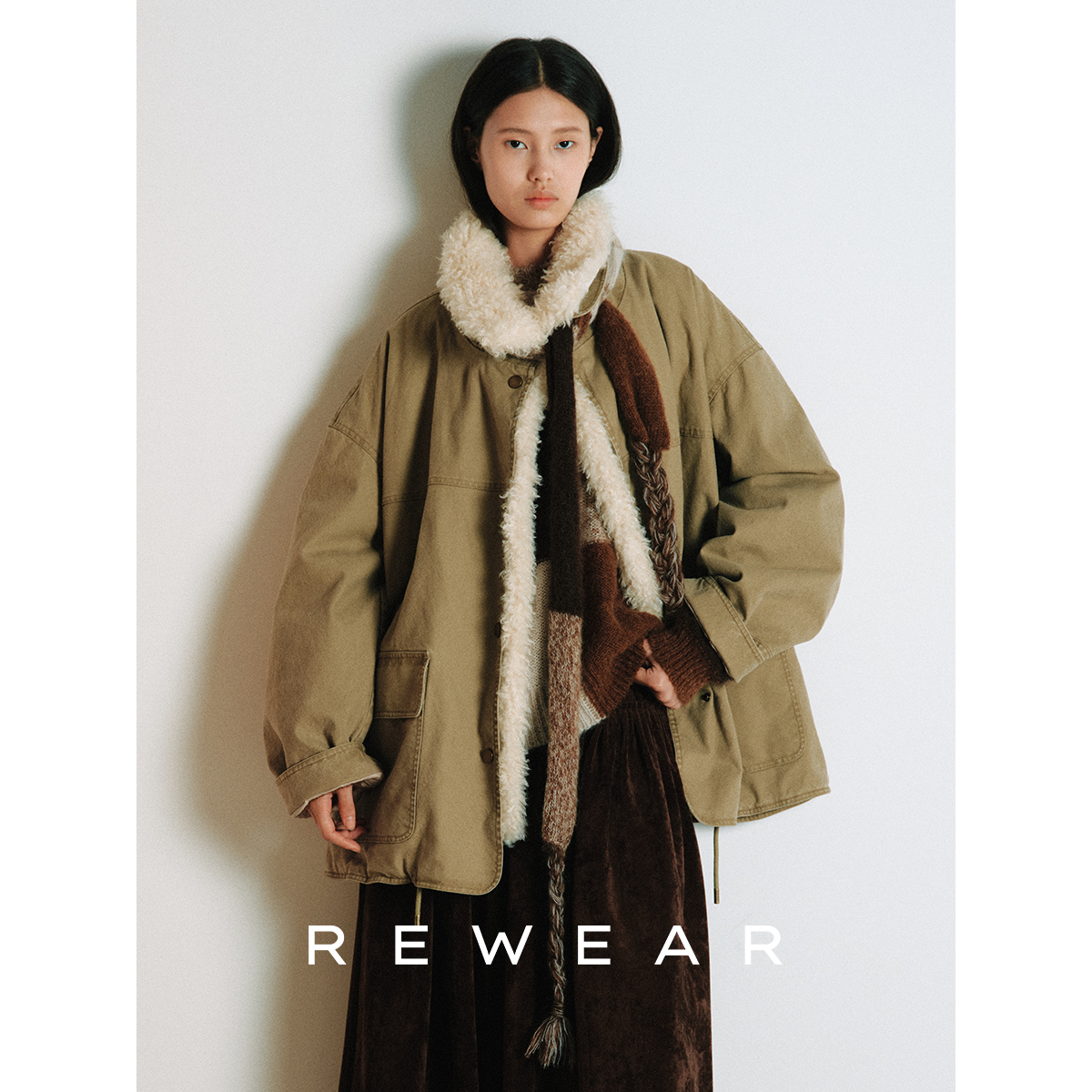 REWEAR/heavy industry fermentation washing quan cotton bead sail washing fade detachable imitation lamb wool collar workwear parker cotton suit 11355