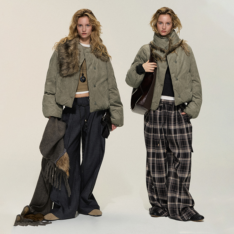 【Di Lieba Wang Churan Same Style】Dpercent|Tea green brown suede fur scarf cotton jacket short coat
