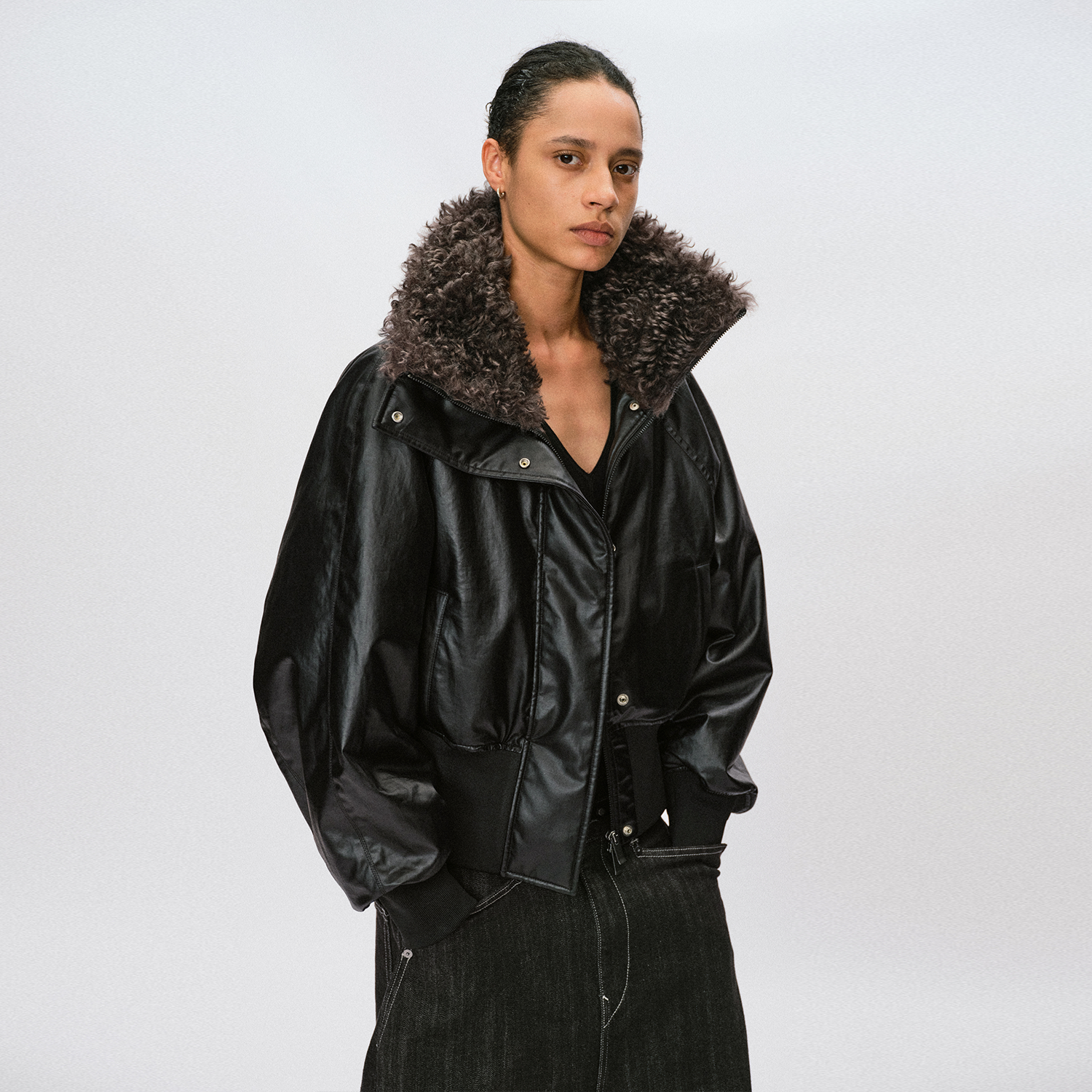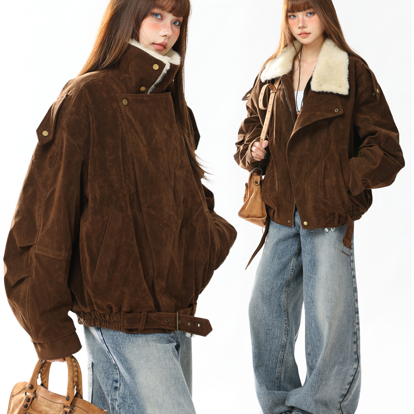 REWEAR/Eco-friendly flocked suede imitation cowhide texture retro silhouette cross-collar short jacket cotton jacket 11248