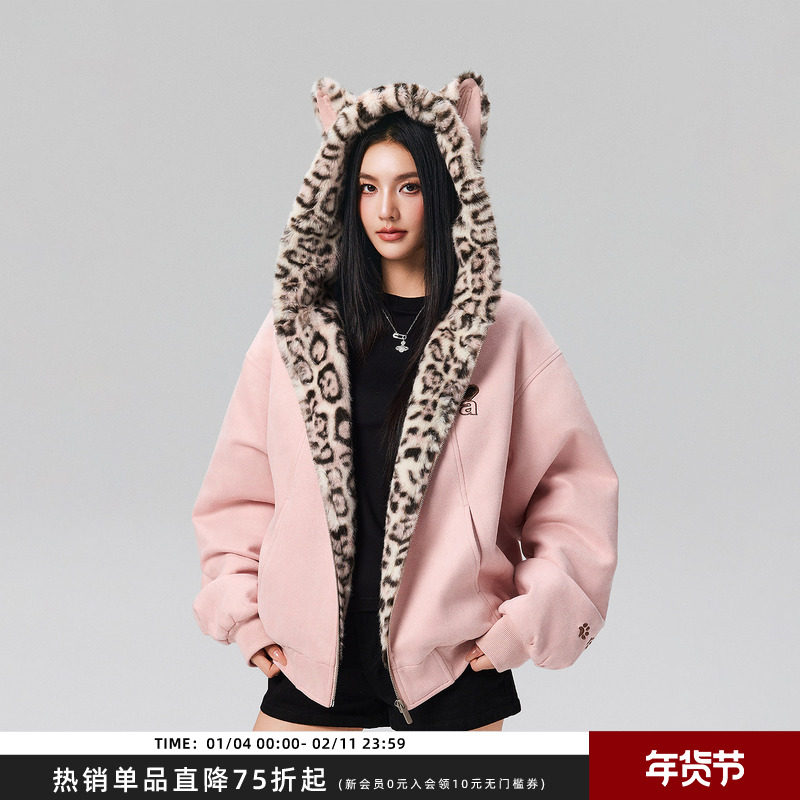 【Achock Official Store】Mu Zhicheng's same rabbit ear warm sweatshirt leopard print zipper hooded fleece jacket for men