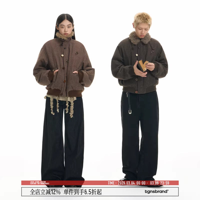 TGNS Barnes style fur collar thick striped jacket women's winter cotton jacket men's American vintage padded jacket brown cotton jacket top