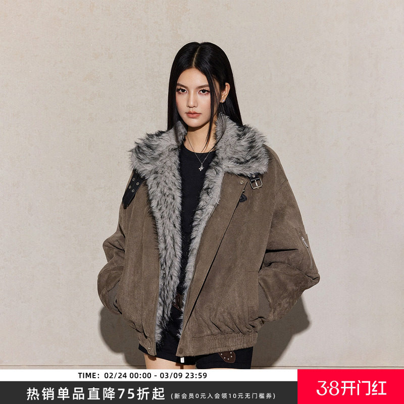 DESERTO "One Piece for the Winter" 1500G wolf fur matte cowhide fleece hooded short wide seat mountain carving cotton jacket