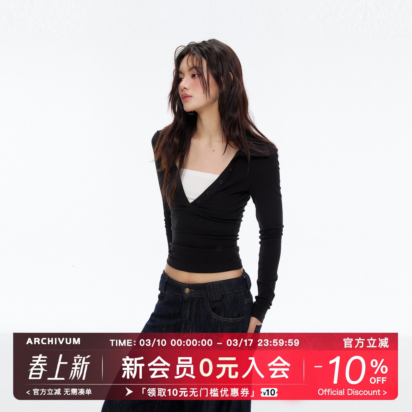 Archivum Fake Two Contrasting Polo Deep V-Neck Knit Long Sleeve Versatile Commuter Slimming Spice Top