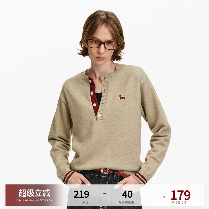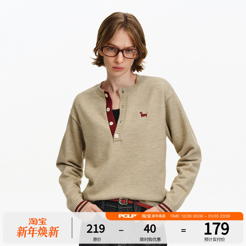 PCLP neutral color henry collar sweater spring and autumn loose retro trend lazy couple pullover long sleeve knitwear