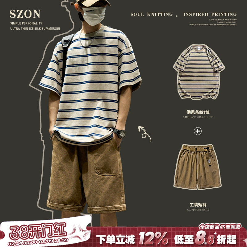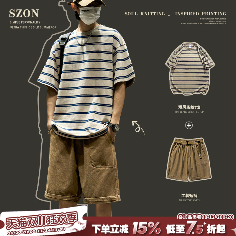 Casual suit men's summer American retro outfit with a full set of striped short-sleeved T-shirts with loose cargo shorts