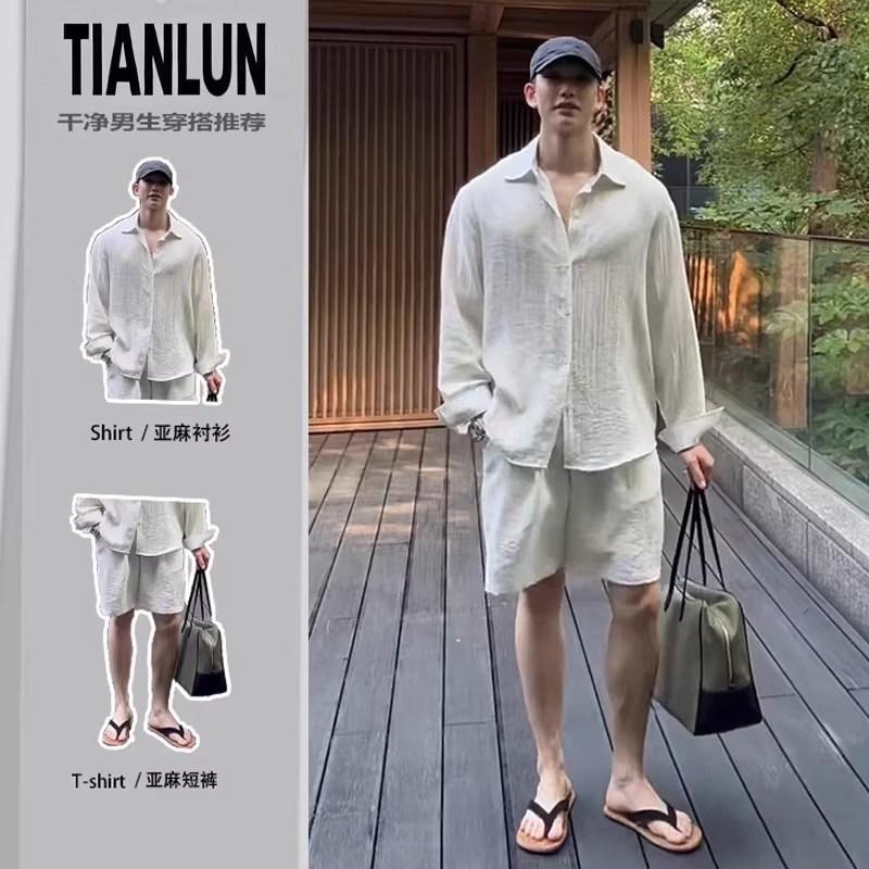 Old money style linen sunscreen shirt shorts a complete set of ootd outfit men's lazy wind relaxation two-piece set