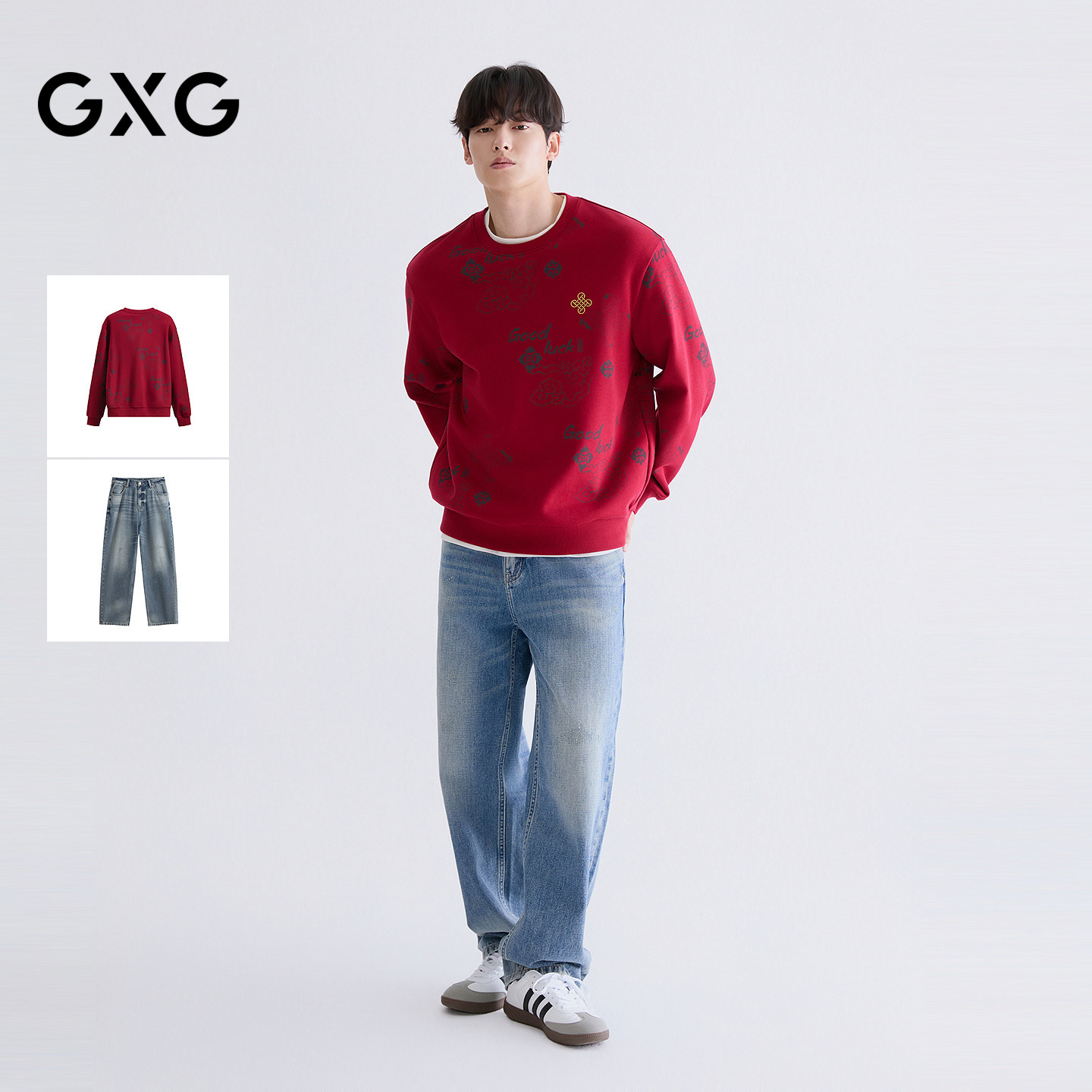 GXG Men's Clothing 26 Spring New Year Full Print Red Sweatshirt Washed Linen Jeans Commuter Set