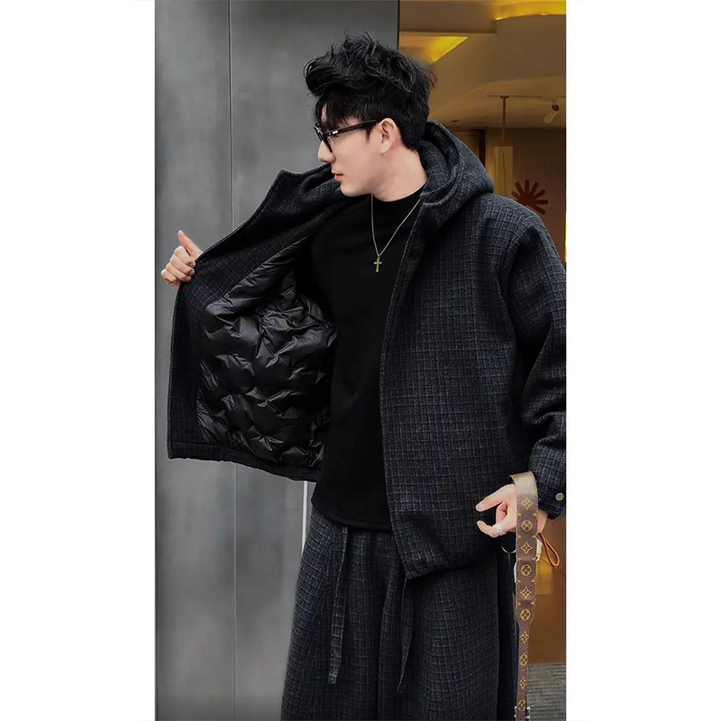 Cool and handsome outfit for boys: a high-end hooded down padded jacket, plaid jacket with wide-leg pants