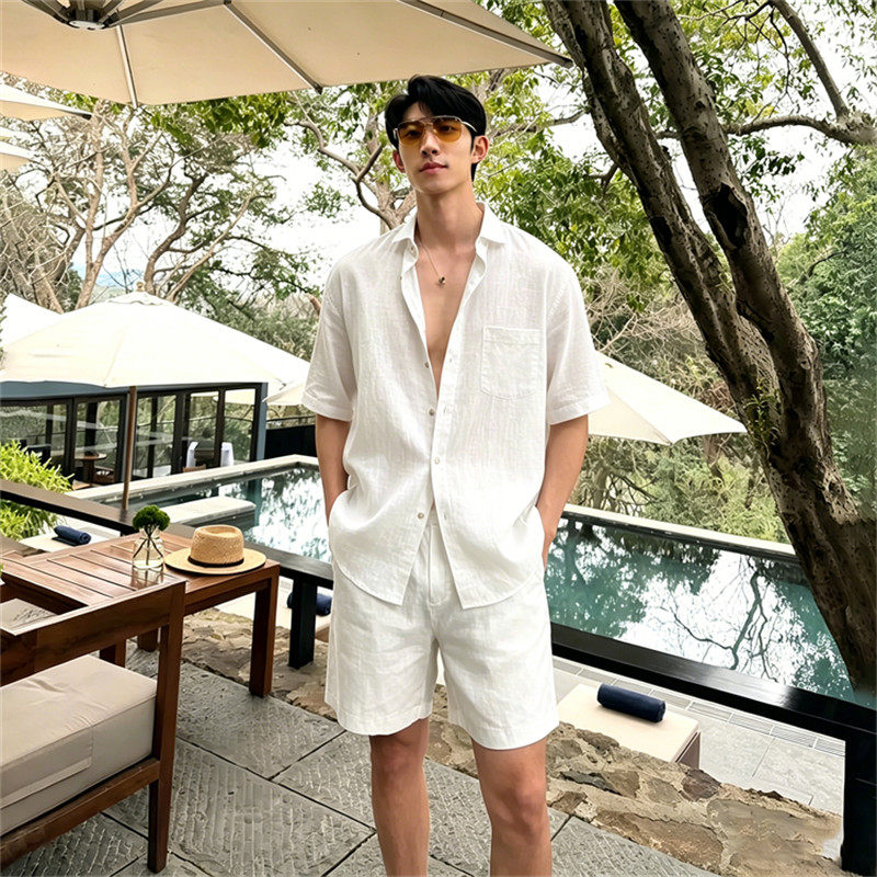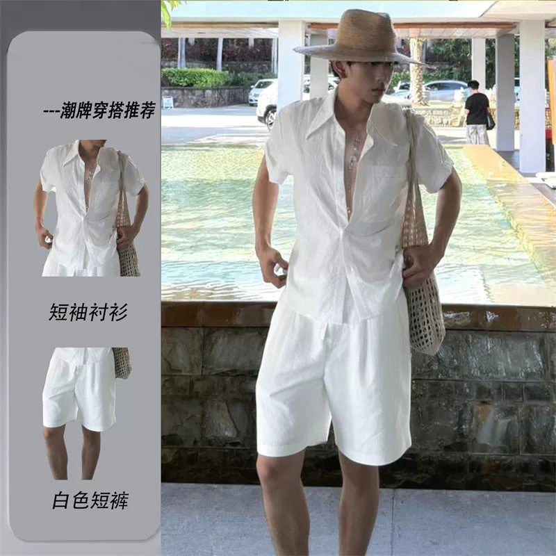 Light luxury, lazy and relaxed, wear a complete set of men's old money style summer vacation sunscreen shirt shorts two-piece set