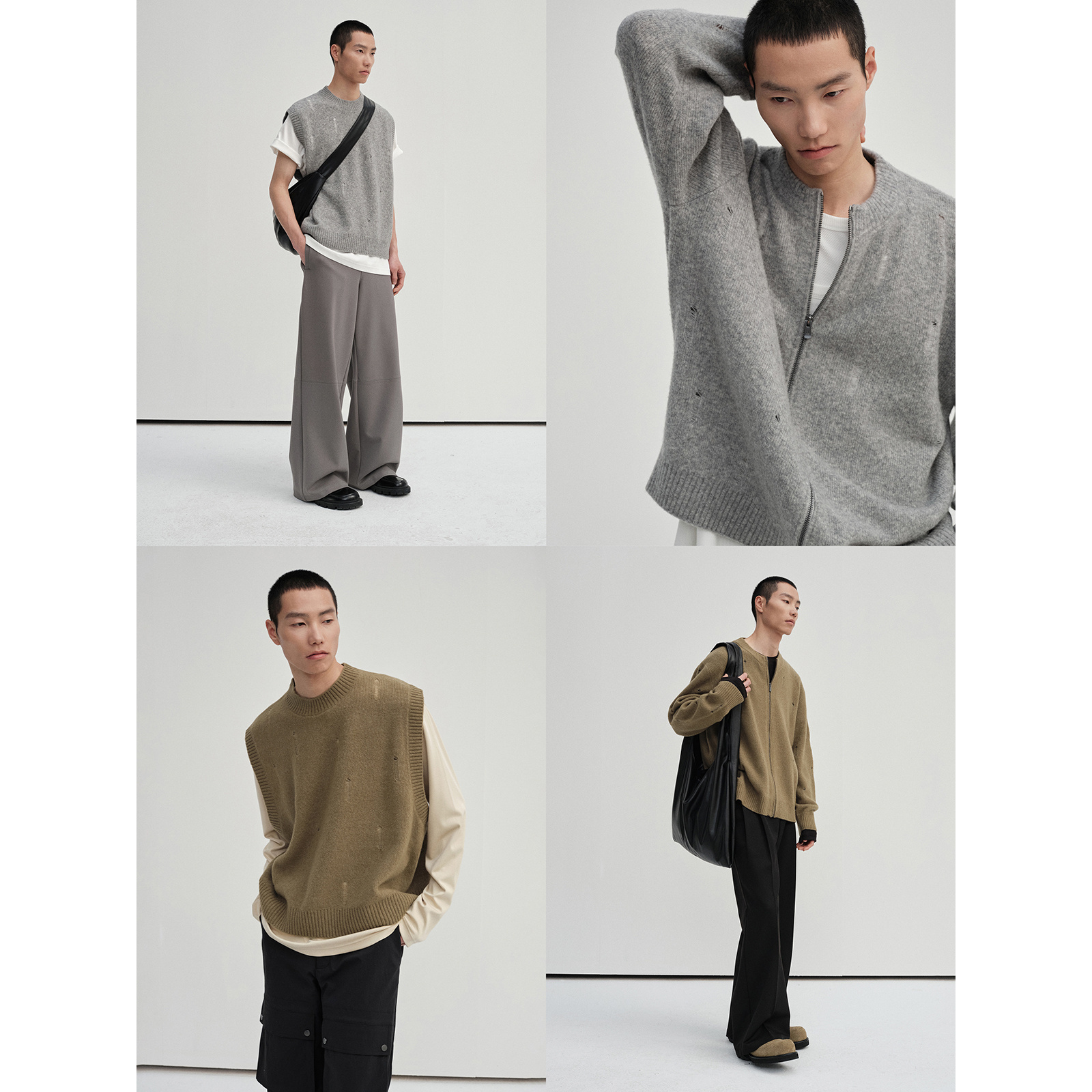 NANS Yak Wool Sheep Wool Blend Irregular Rip Hollow Crew Neck Knitted Cardigan/Gilet NS8A08