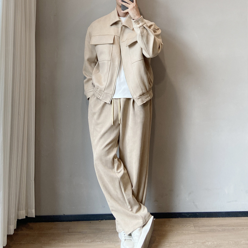 Autumn new suede fashion outfit suit: light and simple, loose lapel jacket, high-end two-piece men