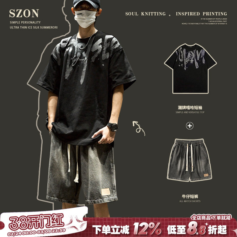 Short-sleeved suit men's summer American high street ruffian wears a full set of graffiti printed T-shirts with denim shorts