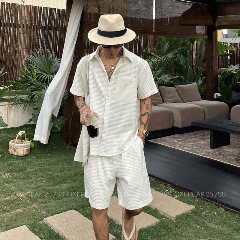 Old money style white wagaf short-sleeved shirt men's summer vacation casual shirt a complete set of ootd outfit set